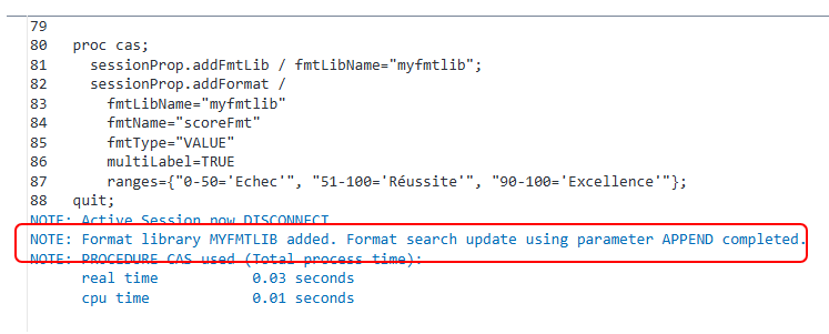 L'action sessionProp.addFormatAction CAS chargeant une bibliothèque de formats personnalisés dans la session active. Elle rend ces formats disponibles pour traiter et afficher les données en mémoire. est votre outil de choix pour ajouter des formats personnalisés à une bibliothèque de formats CAS existante. Imaginez-la comme un traducteur personnel pour vos données, capable de transformer des valeurs brutes en libellés explicites (parce que lire '1' et '2' c'est bien, mais lire 'Ventes' et 'Marketing' c'est quand même plus clair, n'est-ce pas ?). Elle permet de spécifier le type (VALUE, PICTURE, INVALUE), les plages de valeurs, et même le comportement multilingue. Source : .