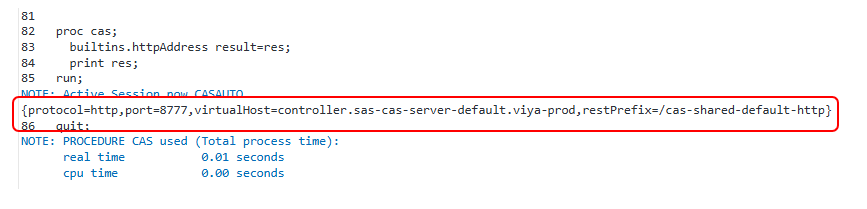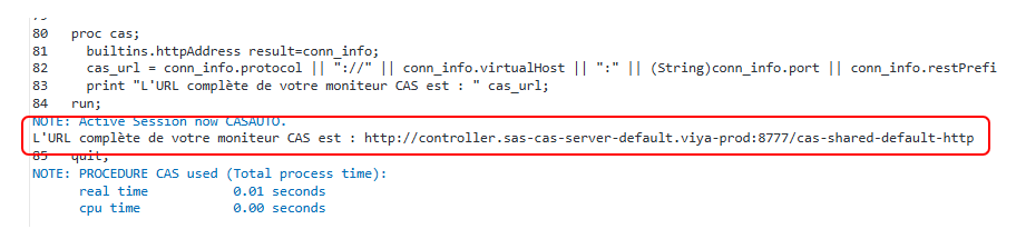 Comme il s'agit d'une action système (builtins), `httpAddress` lit directement la configuration de votre serveur CAS. Vous pouvez donc lancer le code directement sans charger la moindre table. Parfait pour les jours de paresse !