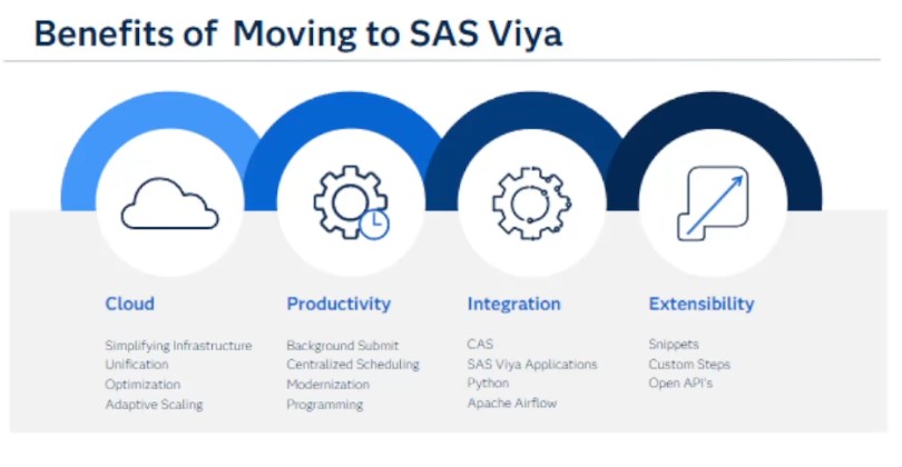 - Gains de productivité : Soumission en arrière-plan (Studio), planification centralisée (SAS Job Execution Service dans Viya, contre planificateurs externes pour EG), support multi-langages.